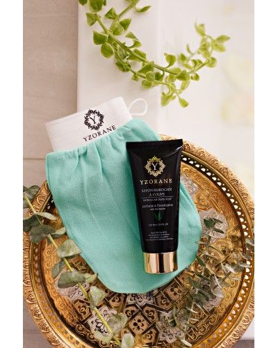 30g de savon marocain à l'olive parfumé à l'eucalyptus et 100% naturel OFFERT GRATUITEMENT avec le gant d'exfoliation Yzorane.